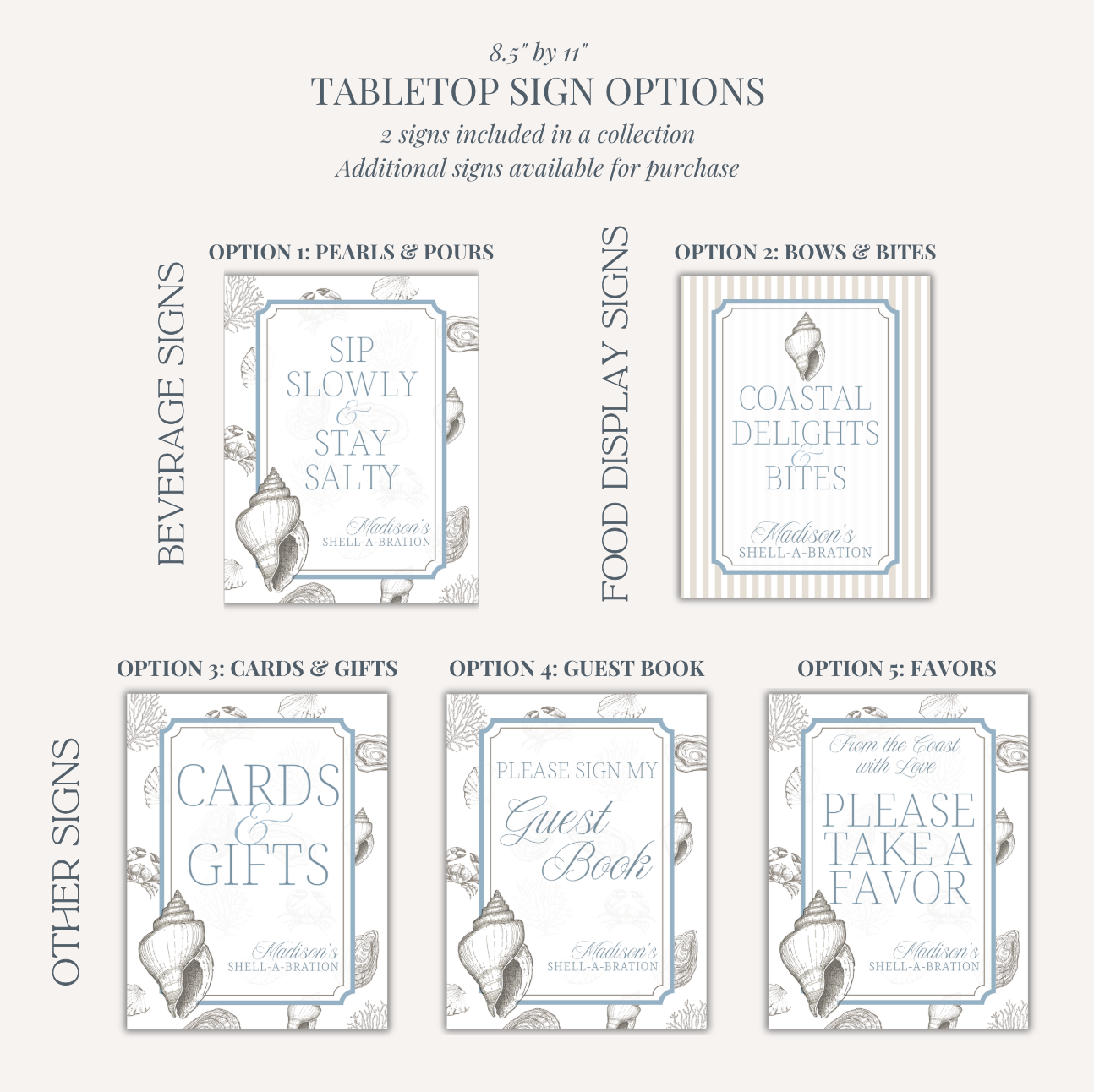 - Two (2) Tabletop Signs of your choice from our design options (i.e., beverage bars, activities, or food displays). Includes wooden blocks for stand-up display.